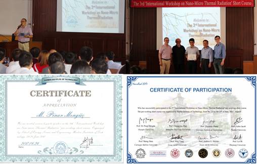本次短期课程邀请到了微纳尺度热辐射领域8位国际著名学者为嘉宾讲师,包括定量光谱与辐射传输杂志主编、土耳其安兹耶因大学Pinar Menguc教授,定量光谱与辐射传输杂志副主编、美国佐治亚理工学院Zhuomin Zhang教授,定量光谱与辐射传输杂志副主编、美国德州农工大学Ping Yang教授,美国德州农工大学Andrew Dessler教授,美国卡内基梅隆大学Sheng Shen教授,美国普渡大学Zubin Jacob教授,上海交通大学赵长颖教授,浙江大学毕磊教授。八位嘉宾讲师为参与学员讲授了精彩纷呈的微纳尺度热辐射系列课程,学员们的参与热情高涨。培训课程期间,不少学员向嘉宾讲师索要签名。培训课程结束后,每位嘉宾讲师被授予了参与证书,并为每位学员颁发了结业证书。此次短期课程的组织非常成功,获得国际微纳尺度热辐射研讨会发起人Zhuomin Zhang教授和Pinar Menguc教授的高度赞扬。