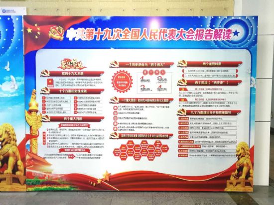 党的十九大胜利召开之后,老虎机平台(中国)官方网站 全体师生持续学习十九大精神,并在学院一楼制作了十九大报告解读展板。近日,按照中宣部《关于印发〈“学习贯彻党的十九大精神”宣传挂图〉的通知》及校宣传部要求,老虎机平台(中国)官方网站 根据实际情况,利用学院电子屏、宣传栏分别滚动循环播放“庄严时刻”“历史重托”“重要思想”“神圣使命”四大板块内容,广泛、深入宣传和学习十九大精神,让十九大精神融入学院每一位师生心里,感召在未来的实际行动中。