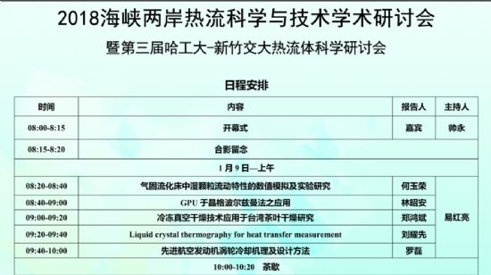为促进海峡两岸能源科学学术交流,分享能源技术发展成就与经验,加强两岸能源科学与工程领域的合作,搭建哈工大与台湾地区高校之间在能源领域热流体科学方向的学术交流平台,促进学生培养和人员交往,自2016年起,定于两岸之间轮流召集双边会议,促进开展下一步的学生交流和交换,为今后联合申请研究项目搭建平台。2018海峡两岸热流科学与技术学术研讨会日程安排如下: