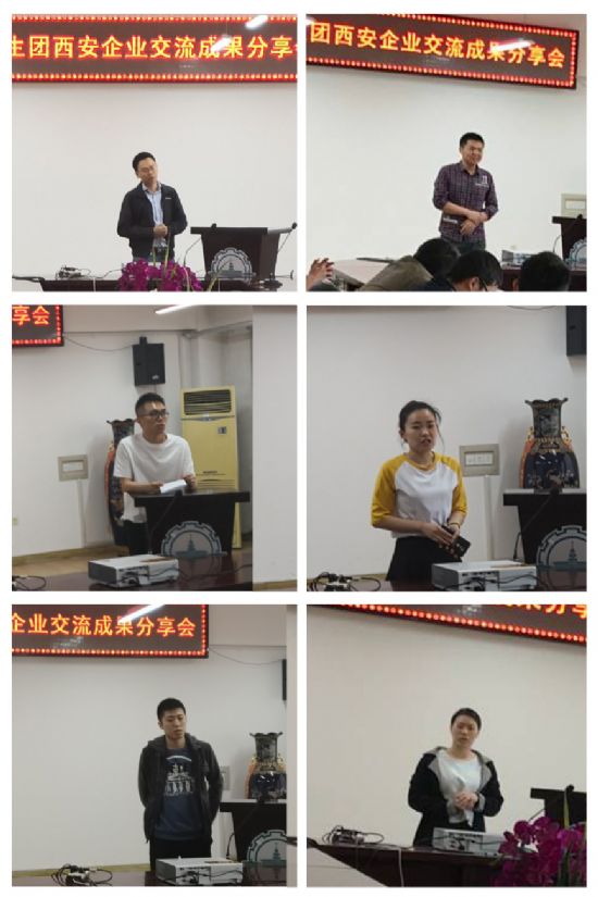 分享会上,参加实践的8名同学分别对活动中走访的西安热工研究院有限责任公司、中国航天科技集团公司第六研究院第一六五研究所、西安交通大学、航天科技集团公司第六研究院第十一所和中科院西安光学精密机械研究所的管理模式、经营文化、长远目标以及工作人员的工作态度进行了介绍。随后,团队成员潘庆辉、马继承、许飞、邱丹丹、李会一和赵志奇6名同学分别为大家介绍了参加活动过程中的心得和体会。最后,苏文涛老师向同学们详细讲解了此次企业交流活动的主题和意义,并展示了此次企业学术交流活动的丰硕成果,让与会学子感受交流活动的魅力,激发同学们参加企业交流活动的热情。相信很多同学听了这次分享后对各企业、研究所和院校会有更直观深刻的感受,希望能够以此为出发点广泛带动学生们参与到企业学术交流活动中去。