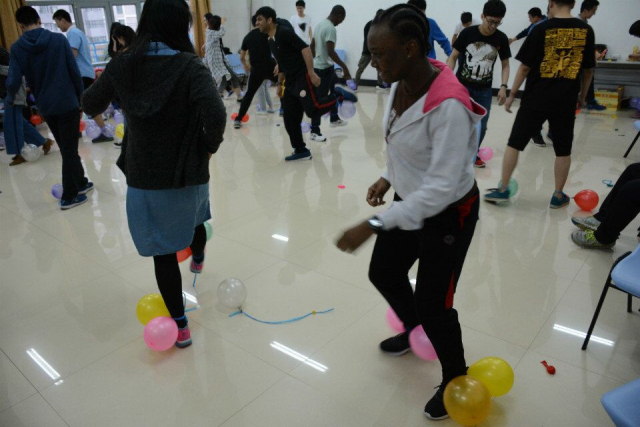 本次趣味运动会分为“你划我猜”、“各尽所能,协调发展”、“踩气球”三个环节。所有参赛成员分为六个小组,组员间需要密切配合才能完成游戏。在“你划我猜”中,组员们根据工作人员给出的词语,充分发挥想象力,运用肢体语言为同伴描述信息,全场响起阵阵欢笑。第二个环节包括乒乓球托球跑、转呼啦圈、踢毽子三个项目,各组成员都认真地制定战术,展现出了较高的运动水平和协作能力,让人意外的是留学生们在踢毽子项目上大放异彩,赢得了阵阵掌声。最后的踩气球游戏为集体项目,六组成员共同参与,大家双腿绑上四个气球,场上气氛十分热闹,同学们在这场“厮杀”中拉近了彼此的距离。最终第六组成员们团结一心、配合默契赢得了本环节的胜利。