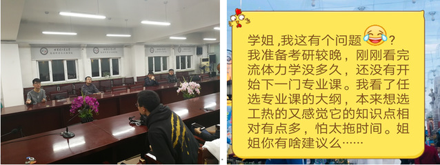 线下在动力楼619进行,主要分为两个部分,第一部分由各学长学姐对本阶段的复习方法、复习技巧、时间安排等提出了自己的建议,以及考研结束后对自己的总结,针对自己的不足提出改进方法给学弟学妹们进行了分享。胡羽学长针对各科的复习提出了关于时间安排、复习方法、复习重点的建议;卢才磊学长根据自己的考研经历,总结经验与不足,主要针对数学和专业课提出了自己的建议;刘秀婷学姐针对英语的复习方法、政治与专业课的复习建议等提出了自己的建议与看法,并强调了合理安排时间、调整心态、注意休息的重要性。刘思宇学长针对政治与专业课方面的复习安排进行了分享。第二部分为自由提问环节,备战考研的同学们针对自己的困惑与疑问,向学长学姐们提问,由他们进行解答。整个经验分享会进行地如火如荼,听完学长学姐们的经验分享,一定程度上给备战考研的同学们指点了迷津,通过提问互动的方式,也给他们关于考研路上的困惑进行了解答。相应的专业课方面的解答由相应的学长学姐进行,提高了答疑效率,精准了答疑的专业性和效果,线上的提问也进行的十分火热,本次考研经验分享会取得了良好的效果。