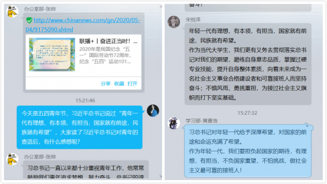 在学习结束后的线上讨论过程中,大家对当代青年肩负的时代责任与习总书记对青年一代寄托的期望展开了讨论。