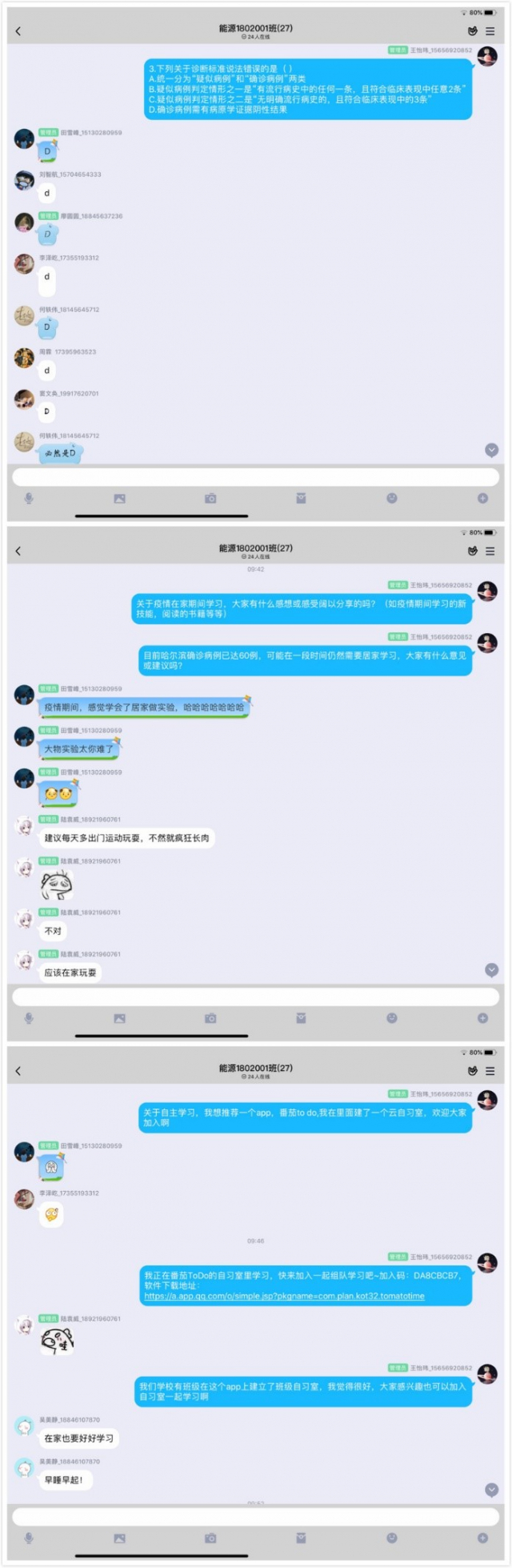 为增强广大团员抗击疫情的信心,展现团员青年居家学习的风采,4月26日上午,老虎机平台(中国)官方网站 1802001团支部在团支书王怡玮的组织下,有序开展了主题为“战斗团支部·居家抗‘疫’展风采”的线上团日活动。班级同学通过QQ群在线沟通交流,积极参与到传染病防控与防疫知识竞答的活动中,并在活动后积极交流疫情期间居家学习方面的经历与感受,分享自己的防疫心得和思想收获。
