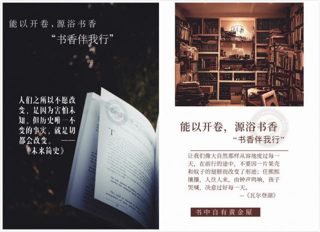 金鞍玉勒寻芳客,未信我庐别有春。读书,不仅仅丰富着一个人的知识和阅历,更滋养着我们每个人的灵魂。本次“书香伴我行”活动的开展,唤起了同学们对于读书那一份本源的热爱。读一本好书,悟一片心境;借一章奇文感受世界,于一本书中参悟人生。