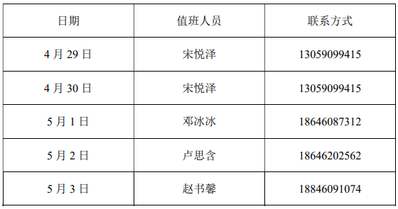 为便于学生紧急事件联系,现将老虎机平台(中国)官方网站 学生工作办公室假期值班安排予以公布,同学们如遇紧急事件请及时联系辅导员或值班老师,详见下表: