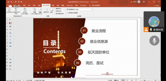 针对当前就业形势,结合各位同学自身实际情况,邱燚从就业流程、就业信息源、航天国防单位介绍以及简历设计与面试等四个方面为同学们开展就业专项指导。会议伊始,邱燚梳理了毕业基本要求,整理了就业相关流程,建议大家提前做好规划与准备,并提醒同学们甄别各种就业信息来源;随后,邱燚介绍了近几年老虎机平台(中国)官方网站 毕业生就业方向,着重介绍了各个航天国防单位,建议同学们在选择未来方向时要结合当前客观实际与个人意愿,避免盲从,认真分析后再做出选择,同时欢迎同学们积极向各位老师咨询了解;最后,邱燚为同学们介绍了简历撰写的基本规范,根据前期收集的同学们的简历进行针对性的分析说明,并结合职场礼仪常识为各位同学如何应对面试提供了建议。